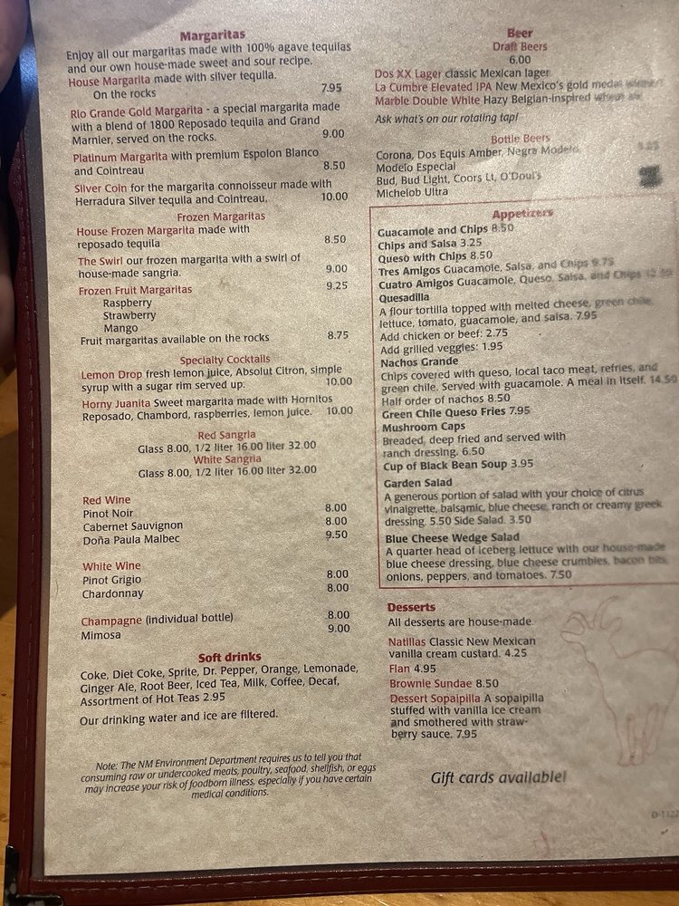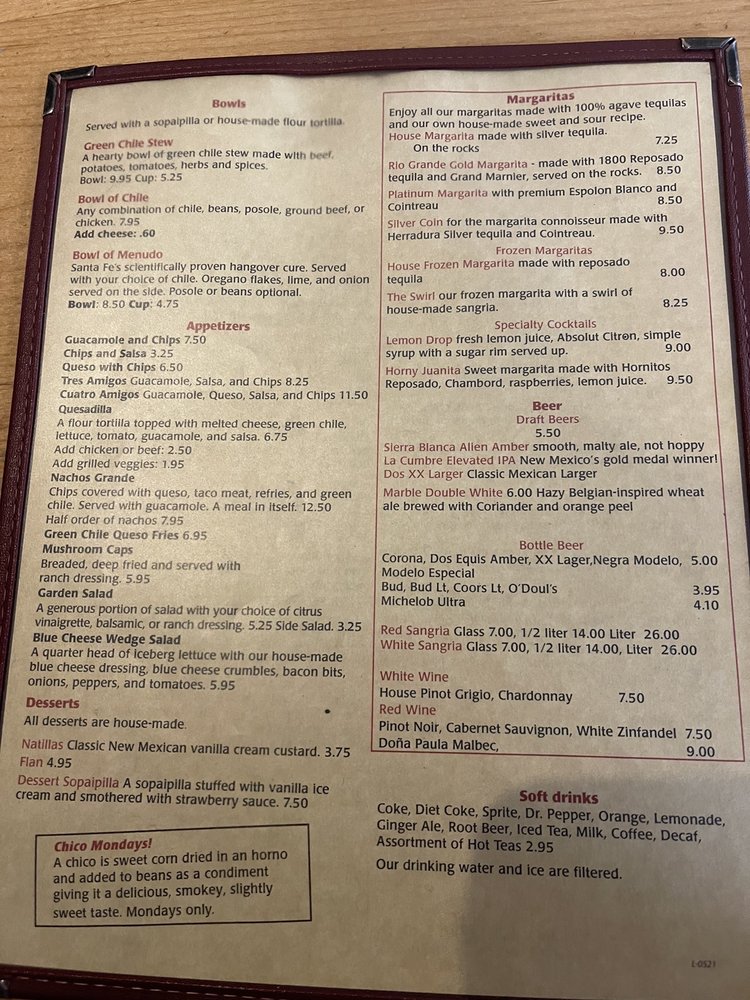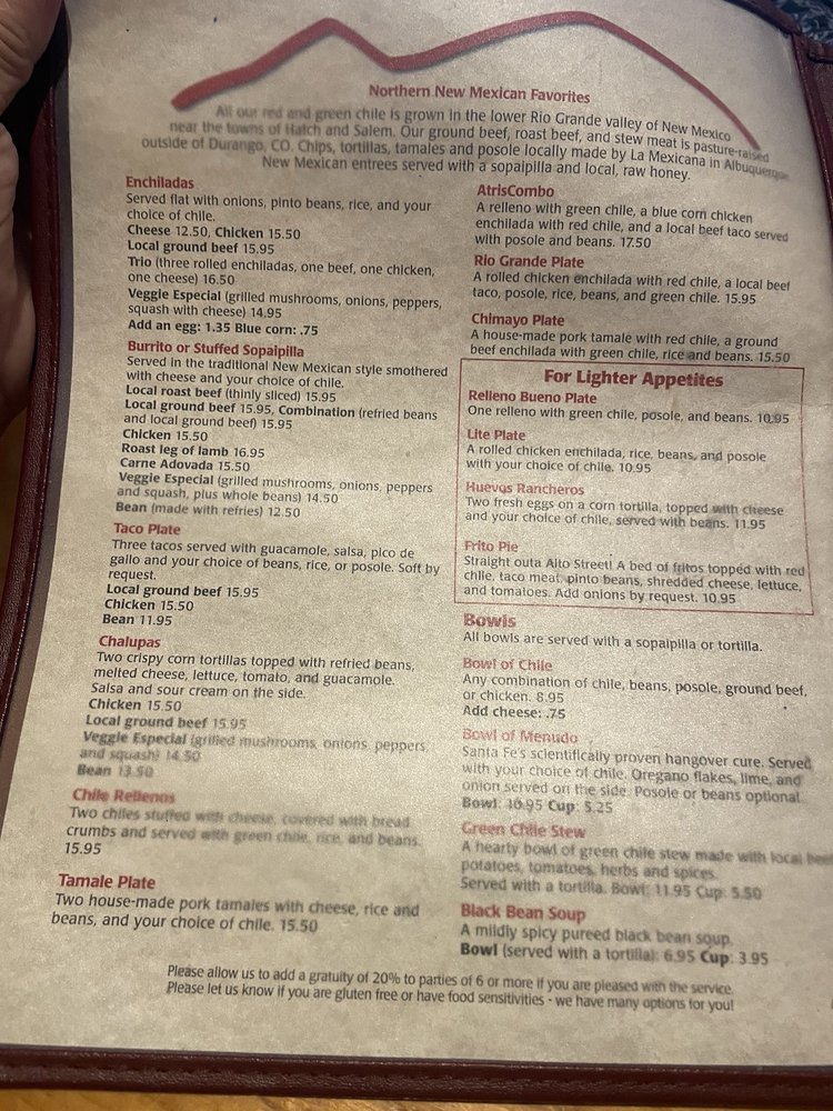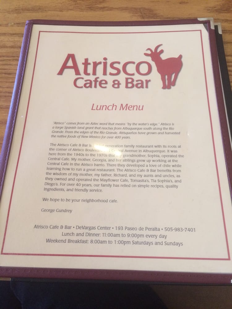 Introducing the menu at Atrisco Cafe & Bar, a cozy spot in Santa Fe offering a range of New Mexican favorites. From flat enchiladas to smothered burritos and stuffed sopaipillas, there's something for every craving. Build your own bowl with various delicious ingredients or try the scientifically proven hangover cure - a bowl of menudo. Aside from traditional dishes, the menu also includes burgers, salads, and more. Customers rave about the flavorful offerings like the black bean soup, roast beef sandwich, and Southwest chicken salad. The friendly staff, prompt service, and fantastic margaritas make dining at Atrisco a delightful experience. Don't miss out on their signature sopapillas, served with honey for a sweet finish to your meal. Whether you're a local or a tourist, Atrisco has become a go-to spot for tasty New Mexican cuisine.
